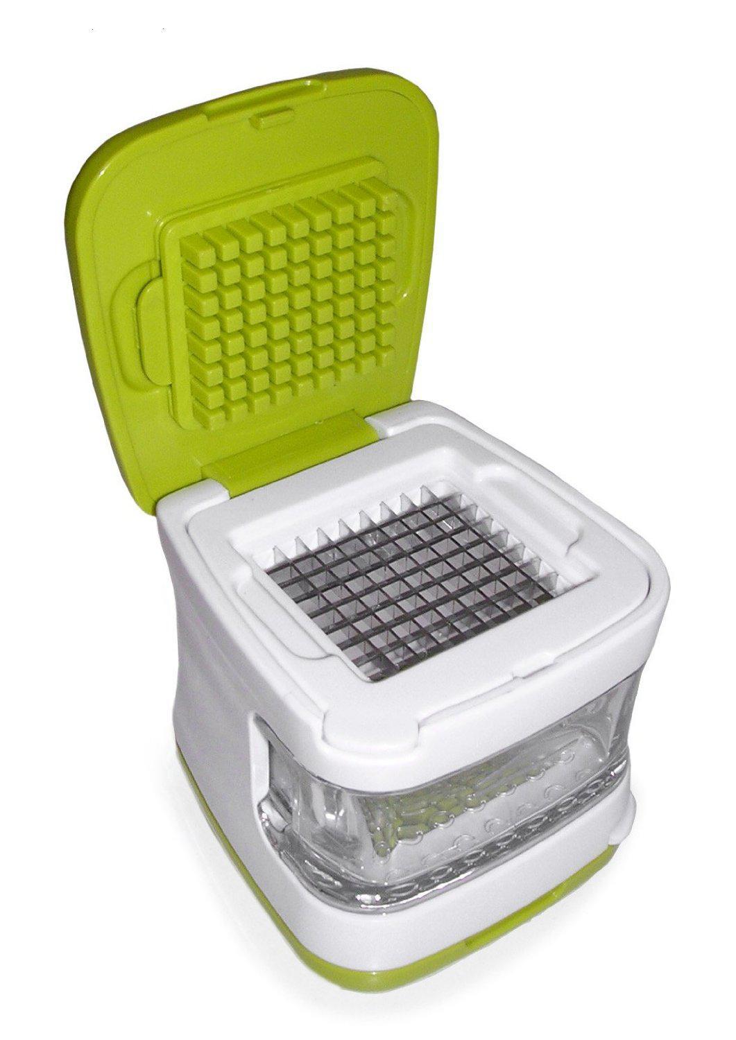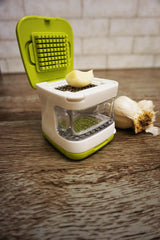 This compact gadget minces or slices peeled garlic and deposits it neatly in the clear bin. Simply open the green lid for the mincing option, align the bin, or flip the cube and bin over for the slicing option. Parts are easy to remove for dishwasher safe cleaning.