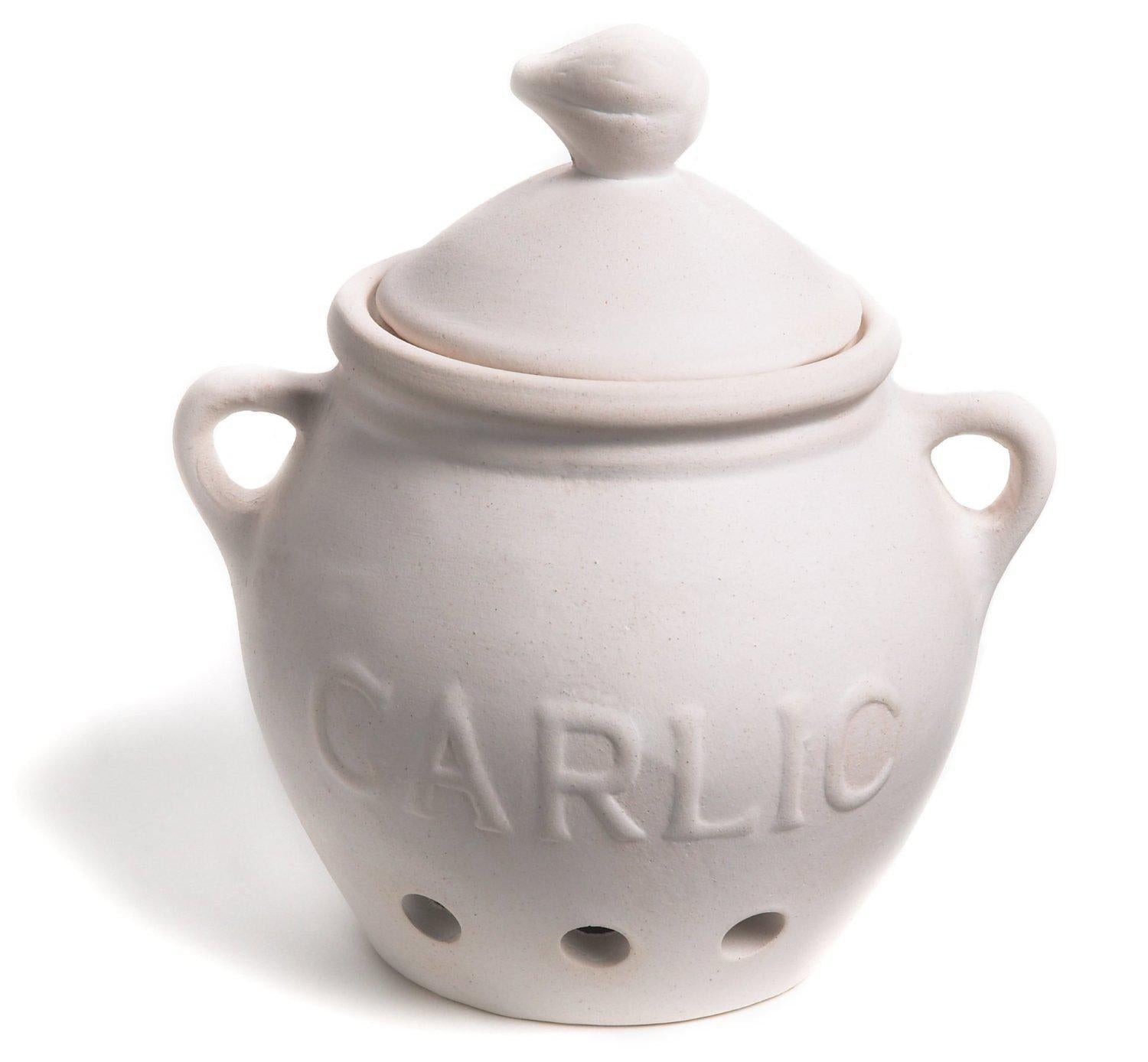 More times than not, some fresh garlic is just what you need to liven up a dish. Perfect for storing your go-to flavor enhancers, this Garlic Keeper is crafted of attractive white ceramic stoneware with a fitting garlic-shaped handle. This nonporous, unglazed stoneware with vent holes promotes proper airflow to preserve garlic cool and dry, and the lid protects from light for a longer shelf life. The jar won't absorb moisture or odors! Add the mouthwatering taste of fresh garlic to your soups, sides, sauces, pizzas, toppings and more. An essential for all garlic lovers!