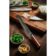Our 10" Slicer knife is a masterful piece of craftsmanship, with a 67 layer AUS10 Damascus steel blade forged in Japan. It's great for slicing meat, fish, fruits and vegetables, and you can use it to create beautiful garnishes and presentations. The razor sharp blade will help you achieve a beautiful, even and paper-thin slice in no time.