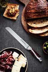 The Hammer Stahl 8" Bread Knife has a scalloped edge that cuts through bread without crushing, tearing, or leaving crumbs.