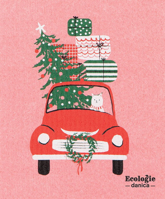 Relish in the good tidings brought by a captivating Cat on this Swedish Winter Wheels Cat dishcloth by Ecologie. From wiping counters and dusting off surfaces to spotless cleaning of mirror and windows, this festive design delivers holiday smiles.