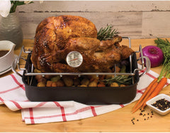 This meat thermometer is an invaluable addition to cooking utensils and chef tools for roasting all types of meat. From beef to poultry, pork, lamb, veal, and even game, using a meat thermometer helps gauge internal temperatures so food cooks properly and remains juicy inside while roasting to a golden brown outside. Ensuring food safety is essential regardless of cooking technique, including roasting, grilling, rotisserie, and slow cooking methods. This instant-read meat thermometer, with universal temperatures in both Fahrenheit and Celsius and shatterproof face, instantly takes accurate temperature readings (between 20 and 220-degrees Fahrenheit) in as few as 5-10 seconds for precision cooking. NSF approved for added food safety, It features an protective sheath that's imprinted with safe target temperatures for easy reference without flipping through cookbooks. Easy to use, simply clean thermometer with a damp cloth before first use. For accurate internal temperature, insert the point of the stem into the thickest part of the meat (at least 1. 5-Inches) without touching the bone and wait until the pointer on the dial stops moving. Cook foods until the internal temperature is within the safe temperature zone. For ongoing accuracy, thermometer is easily recalibrated as needed with the simple use of a wrench. It's the perfect grilling tool when cooking on the electric grill, charcoal or gas grill, BBQ smokers and campfire cooking, too. Made with stainless steel stem and housing, this analog meat thermometer is NSF approved, durable, and compact for easy storage. Clean with a damp cloth or place in the dishwasher for a thorough cleaning. Includes instructions for use and recalibration. Do not use thermometer over the operating temperature range, subject It to extreme temperature change, or use it in the oven.