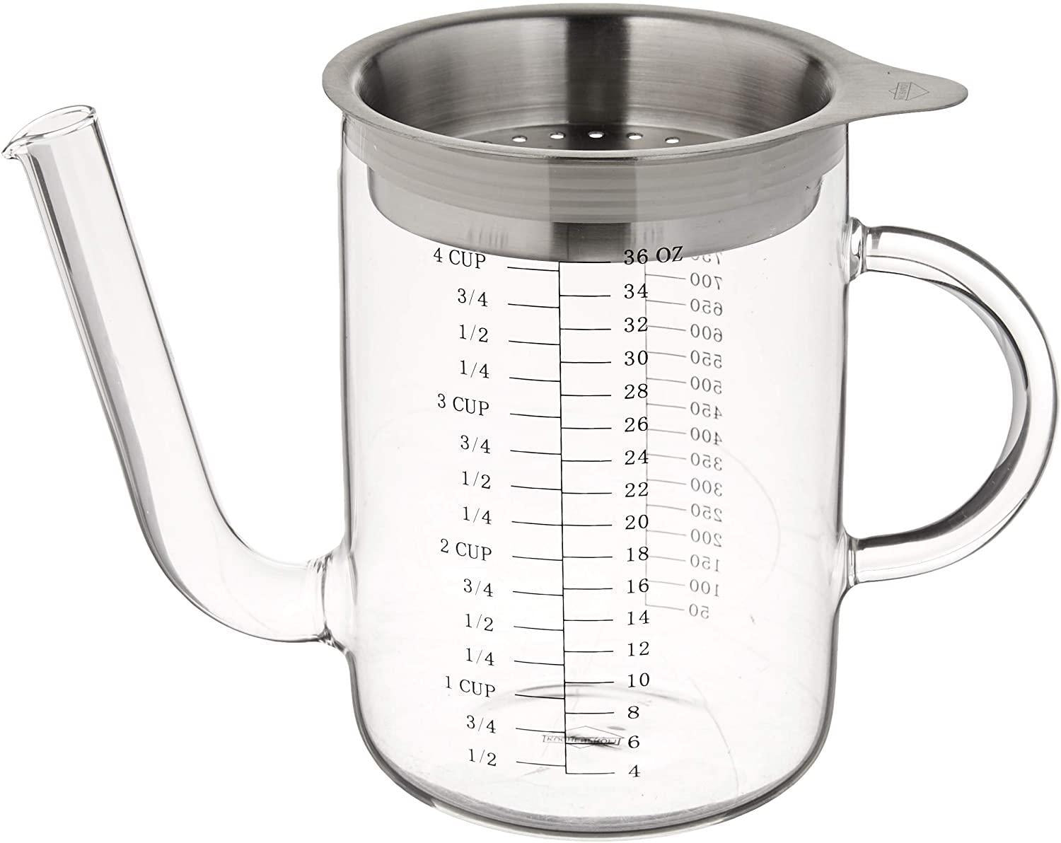 The name of Kuchenprofi reflects strength, quality and functionality demanded by chefs around the world. Kuchenprofi made for professionals, now available to anyone passionate about cooking. For the tastiest, smoothest gravy ever, use Kuchenprofi's Separator to de-fat drippings. Ingeniously designed borosilicate glass pitcher is heat- and flame-safe, with a low-down spout that lets you pour off the juices - and only the juices. - once the fat rises to the top. Better still, there's a lift-off, stainless steel strainer that sits over the mouth, catching burned bits as you pour in the drippings. Pitcher marked with cups and-ounces for easy recipe following.