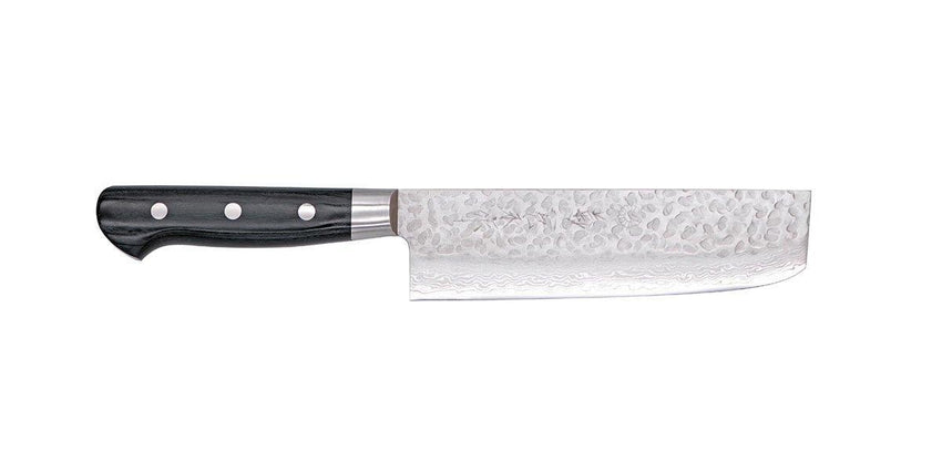 Similar in weight to many German knives, this knife is popular among people who want a western handle and a Japanese blade. With its fine grain structure and great durability, VG10 is one of the best modern stainless blade steels. Sixteen layers of Damascus stainless steel. The hand hammered (tsuchime) finish helps release food from the blade and makes each knife unique.
