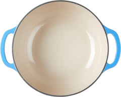 The Lodge Enameled Cast Iron Dutch Oven is a classic and colorful enamel piece that makes every stove look good. But even more importantly, it's a kitchen multitasker. Use it to broil, braise, bake, or roast in the oven up to 500° F, and sauté, simmer, or fry on any stovetop, as well as to marinate and refrigerate food. Smooth glass surface won't react to ingredients. The cast iron vessel has superior heat distribution and retention, evenly heating bottom sidewalls and even the lid. Tightly fitting lid seals in moisture. The excellent heat retention reduces the amount of energy needed for cooking. Stainless steel knob and loop handles for great control. The black rim on the pot is matte porcelain, not exposed cast iron. Although dishwasher safe, hand washing with warm soapy water is recommended to preserve the cookware's original appearance.