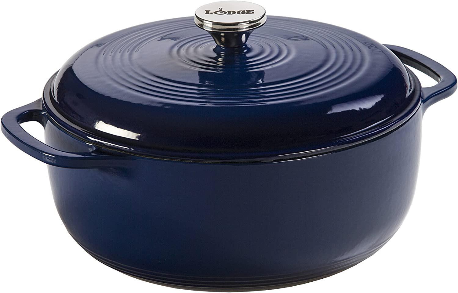The Lodge Enameled Cast Iron Dutch Oven is a classic and colorful enamel piece that makes every stove look good. But even more importantly, it's a kitchen multitasker. Use it to broil, braise, bake, or roast in the oven up to 500° F, and sauté, simmer, or fry on any stovetop, as well as to marinate and refrigerate food. Smooth glass surface won't react to ingredients. The cast iron vessel has superior heat distribution and retention, evenly heating bottom sidewalls and even the lid. Tightly fitting lid seals in moisture. The excellent heat retention reduces the amount of energy needed for cooking. Stainless steel knob and loop handles for great control. The black rim on the pot is matte porcelain, not exposed cast iron. Although dishwasher safe, hand washing with warm soapy water is recommended to preserve the cookware's original appearance.