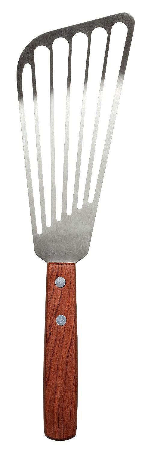 This Fish Spatula is among the must-have kitchen utensils for making all of your favorite fish recipes. Whether you're cooking a whole fish or a fillet, the angled blade easily slides under to gently lift and turn the fish without it breaking apart while the slots allow cooking oils and liquids to drain. A favorite among kitchen tools as both a turner and slotted spatula, it's gentle enough for cooking fish and other delicate foods, like eggs, crepes and omelets, yet sturdy enough for turning burgers, hash browns and grilled sandwiches. Made from 18/8 stainless steel with an attractive rosewood handle. Hand washing is recommended.
