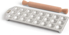 This Marcato classic Ravioli Mold allows you to prepare up to 24 round ravioli at once. The body of the mold is made of die cast aluminum, a solid food-safe material which guarantee a clean cut of the pasta sheet. The rolling pin supplied is made of solid wood. The wood has been specifically selected to be more compact and ensure durability over time. This mold is easy to clean; simply let sit for 30 minutes and then clean with a dry brush. Produces round ravioli (1.6" diameter).