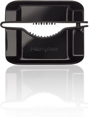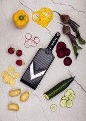 The Microplane V-blade Food Slicer is a mandoline-style slicer that features microplane's sharp stainless steel blade that can slice through a variety of vegetables and fruits with ease. This versatile slicer also features a reversible deck for julienne-style cut vegetables. Use for homemade chips, burgers and sandwiches, fruit infused water, canning and pickling. Use the julienne feature for coleslaws, stir-fry, homemade hashbrowns and perfect toppings!