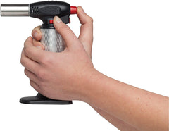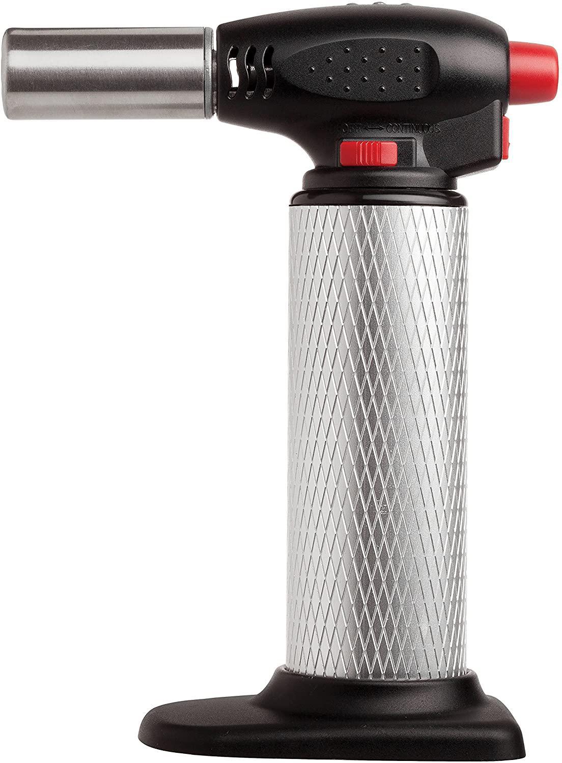 This 6-inch cooking torch is designed to apply even, high heat to a variety of foods for finishing purposes. The torch stands upright and should be stored this way to prevent fuel seepage and to ensure counters will not be damaged by the hot tip. It includes a child-proof safety to prevent accidental ignition. A cooking torch is great for crème brulee, adding sheen to chocolate desserts, finishing off a baked Alaska or briefly heating the surface of other pastries and sweets. You can also use it to brown meats, melt cheese on soups or gratins, add a quick finish to casseroles, make great blackened vegetables or wilt vegetables for salads and other dishes. Butane not included.