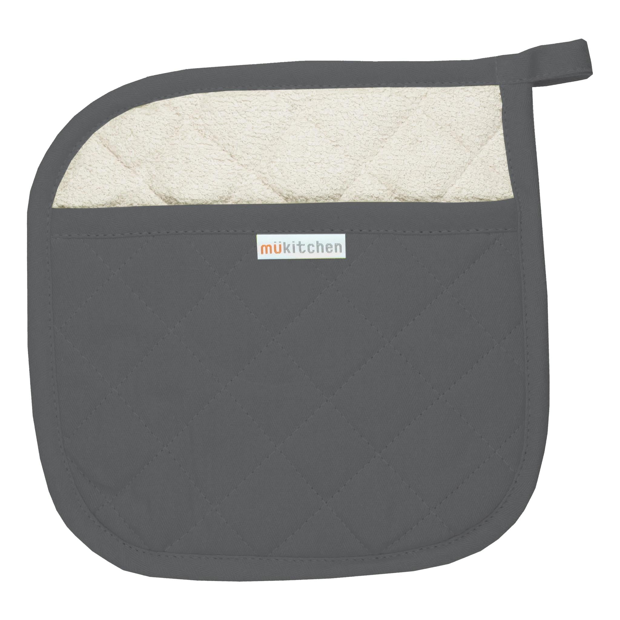 100% Cotton herringbone weave means durability and able to hold up to many washings. Soft terry lining offers extra protection. Hanging loop for added convenience. Mitt measures: 13" x 7"Pot Holder measures: 9" x 9"