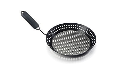 Looking for the utmost in grilling ease? This grill skillet with removable handle from Outset is apart of the Original professional-grade nonstick grillware line providing double-coated nonstick for superior durability. The material is silicone-based, containing no PTFE's. It withstands extreme temperatures from heat and flame and cleans up easily. A removable soft grip handle gives optimal control and comfort. 12" diameter.
