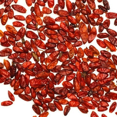 Looking like a hot volcanic puffed rice kernel, dried Pequin Chiles are roughly ½” long by ¼” wide and are reddish orange in color. Pequins are often associated with cuisine from the mountain ranges of northern Mexico. Pequin Chile translates to "tiny chile" and chile heads know that the smaller the chile is in size the larger it is in heat! Pequins are considered a hot chile and these come in at 100,000 to 140,000 SHU (Scoville Heat Units).