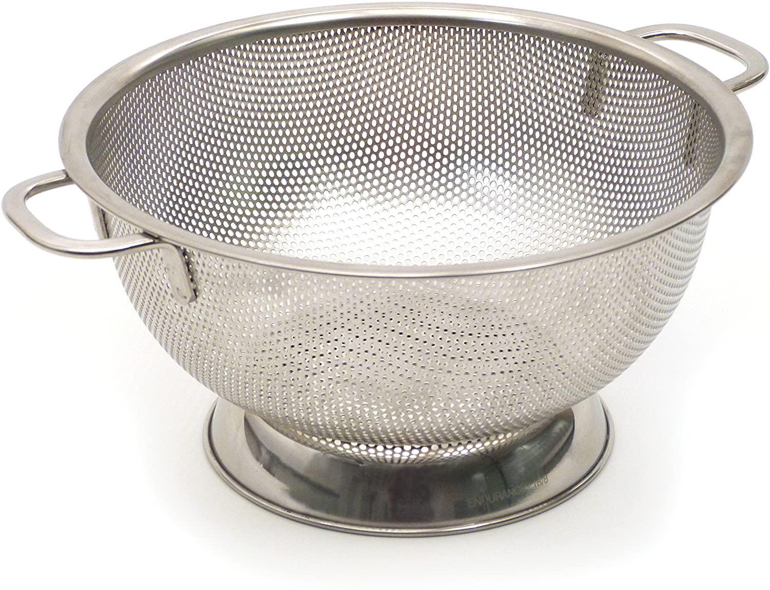 A Cook's Illustrated favorite colander because of the hundreds of holes for fast draining and durable 18/8 stainless steel construction. Measures 8-3/4-inches by 10-3/4-inches (including handles) by 4-1/4-inches tall. Dishwasher safe