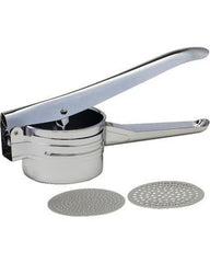 Make lighter, fluffier, lump free mashed potatoes with this brand new chrome plated potato ricer. It not only rices potatoes, but a wide variety of any cooked foods such as apples, sweet potatoes, chestnuts, carrots, cauliflower, and more! This item includes two interchangeable disks - fine and coarse, to tackle any cooking task that comes your way! Measures 10.5 inches.