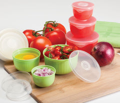 Prep, store and seal ingredients, leftovers, snacks and more with these BPA free nesting bowls with matching lids. Dishwasher safe. Bowls nest together for compact storage. Measurements are embossed on each bowl for easy identification.