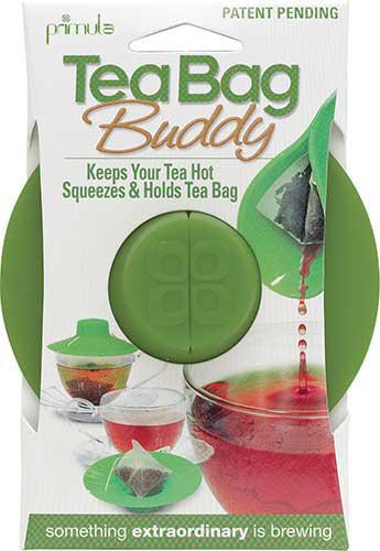 Tea drinkers rejoice! Your favorite beverage just got a little easier to make, thanks to the Tea Bag Buddy by Primula. This neat silicone device is designed to hold your tea bag as your tea brews, and cover your mug at the same time, so your tea stays hot and brews perfectly. All you need to do is thread the string of your tea bag through the slit in the Tea Bag Buddy and up over the separation in the lid. Place the Tea Bag Buddy over your cup and brew. Once the tea has reached your preferred strength, pull the string of your tea bag up and holding the Tea Bag Buddy, grasp the bag and squeeze. The Tea Bag Buddy is made out of silicone, so you don't need to worry about the hot tea bag burning your fingers. Once you've finished with the tea bag, use the Tea Bag Buddy as a tray for it.