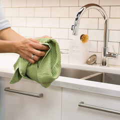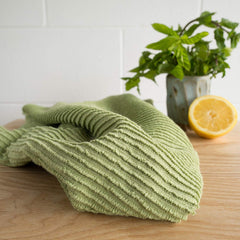 This towel is made of 100% cotton for softness and durability, with a rippled pattern for extra absorbency. This dish towel is handy for wiping up spills around the kitchen, cleaning splatters off the stove, and drying dishes over the sink; the long length allows you to dry your hands right on the rack. Leaf color.