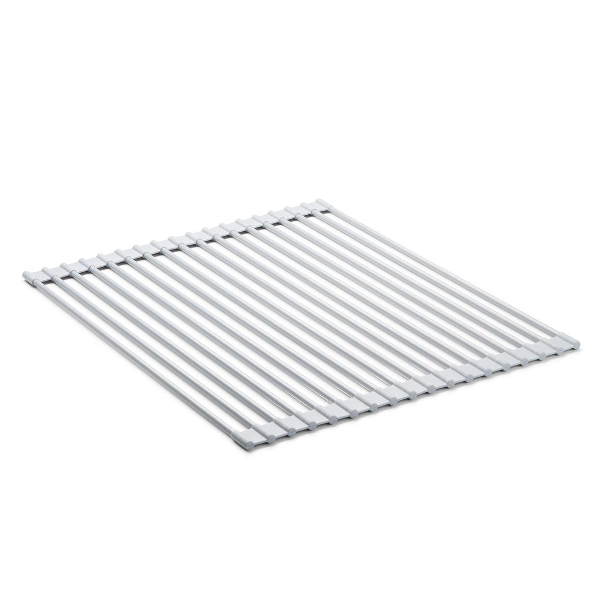 This Over-Sink Roll-Up Drying Rack has plenty of space to wash and dry dishes or fresh produce without blocking access to the sink or counter. Made from food-grade silicone and stainless steel; heat safe (to 446-degrees Fahrenheit); fully sealed design. Rolls out flat over standard-sized sinks, unroll it partially for smaller spaces, and closes for easy storage. You can also use over the sink or on the countertop. Stays in place and grips without scratching; ideal for dishes, cookware, bakeware, fine china, crystal, porcelain, enamel, nonstick cookware, and more. Great for washing and drying produce or as an oversized trivet; takes up less room than traditional drying racks. Dishwasher safe for easy cleanup.