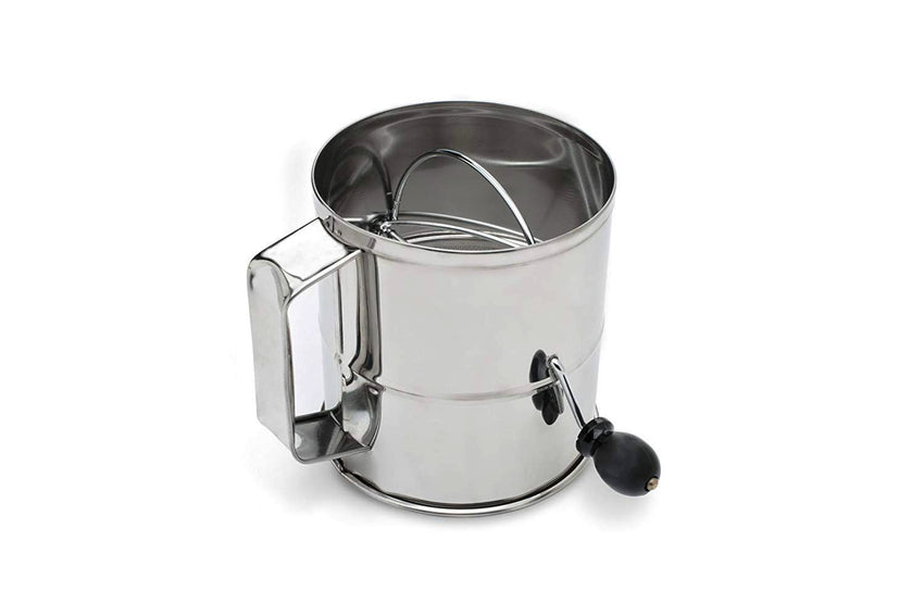 Make mixing flour into other ingredients easier by sifting with this 8-Cup Flour Sifter! This classically styled, crank-handled sifter has been a favorite of bakers for decades. It quickly breaks up any lumps in the flour and aerates it at the same time to give you lighter, more consistent, clump-free results. Made of durable stainless steel with a fine mesh screen, this sifter is the perfect size to sift larger amounts. Easy to use: simply turn the crank handle to deploy the sifter inside. A must-have for making genoise, angel food cake, or sponge!