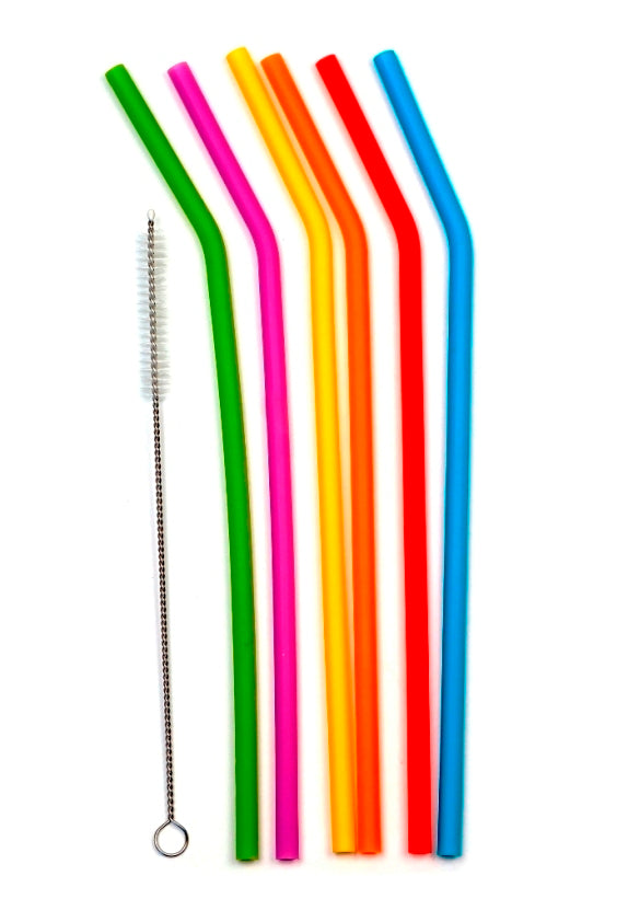 Reduce plastic waste and save money with these colorful reusable silicone straws. Perfect for Iced Coffee, tea, lemonade, and a variety of beverages and cocktails as well as a smart choice for everyday use in a travel mug. Sold in a colorful set of 6 which also includes a cleaning brush for hygienic manual cleaning. Also dishwasher safe. Each straw measures 10-inches. Made from BPA-free, food grade silicone.