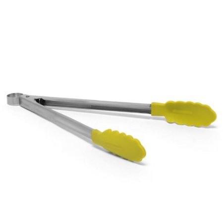 These Silicone Tongs measure 12 inches long and easy to open and close with a patented locking pull mechanism. They have apple green non-stick silicone tips that are heat resistant to 575 degrees Fahrenheit. Dishwasher safe and made of commercial quality stainless steel.