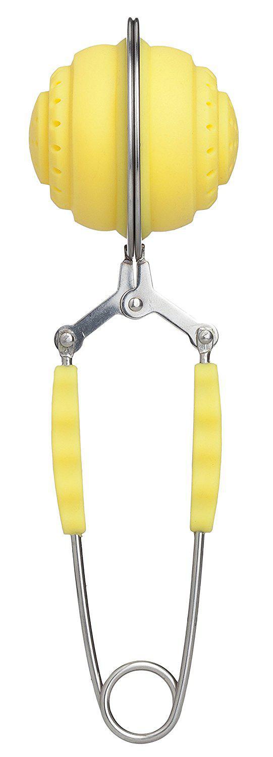 The Silicone Snap Ball Tea Infuser steeps a fresh, more distinct and flavorful cup of loose leaf tea with the same ease and convenience of tea bags. Made from 18/8 stainless steel and BPA-free silicone; heat resistant (390-degrees Fahrenheit); flexible ball stores in tight spaces without denting. The spring-action handle makes filling and emptying easy; squeeze handle to open, fill halfway with tea, place ball end down into cup, pour in hot water. Steep 3-minutes to release the tea's essential oils for maximum aroma and flavor, or until desired strength is achieved; great for mulling spices, too. Reusable and more economical than using store-bought or disposable tea bags; naturally nonstick for easy cleanup; rinse clean or dishwasher safe.