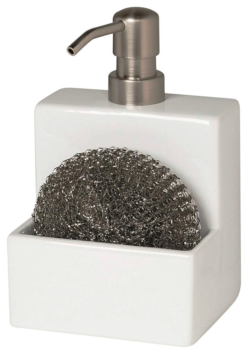Keep your kitchen sink neat and tidy: everything has its place with the new Soap and Scrub. This sturdy ceramic liquid soap dispenser neatly holds a stainless-steel scrubber (included). Refilling from the top eliminates messy leaks. Soap pump is plastic with brushed nickel effect. Dispenser measures 7 inch tall, 4.5 Inch wide and 3.7 Inch deep.