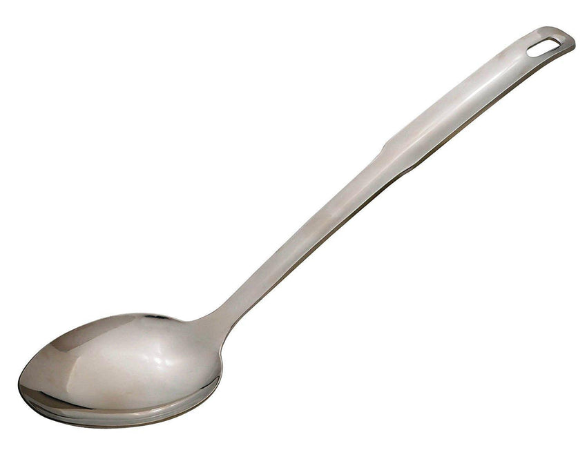 This Solid Stainless Steel Serving Spoon is a hardworking kitchen utensil that’s perfect for cooking, serving and plating foods at every dining occasion. It stirs, scoops and serves up generous portions of foods along with their liquids and sauces. Contoured for a comfortable grip, the longer handle easily reaches to the bottom of deeper pots and pans, mixing bowls and other cookware to stir and retrieve every delicious morsel, and keeps hands away from heat. A hanging hole at the end of the handle keeps it conveniently nearby during food preparation or serving, and stores it neatly on a tool rack, out of the way. Stainless steel 18/8 construction. Measures 4 x 12.5 x 3 in