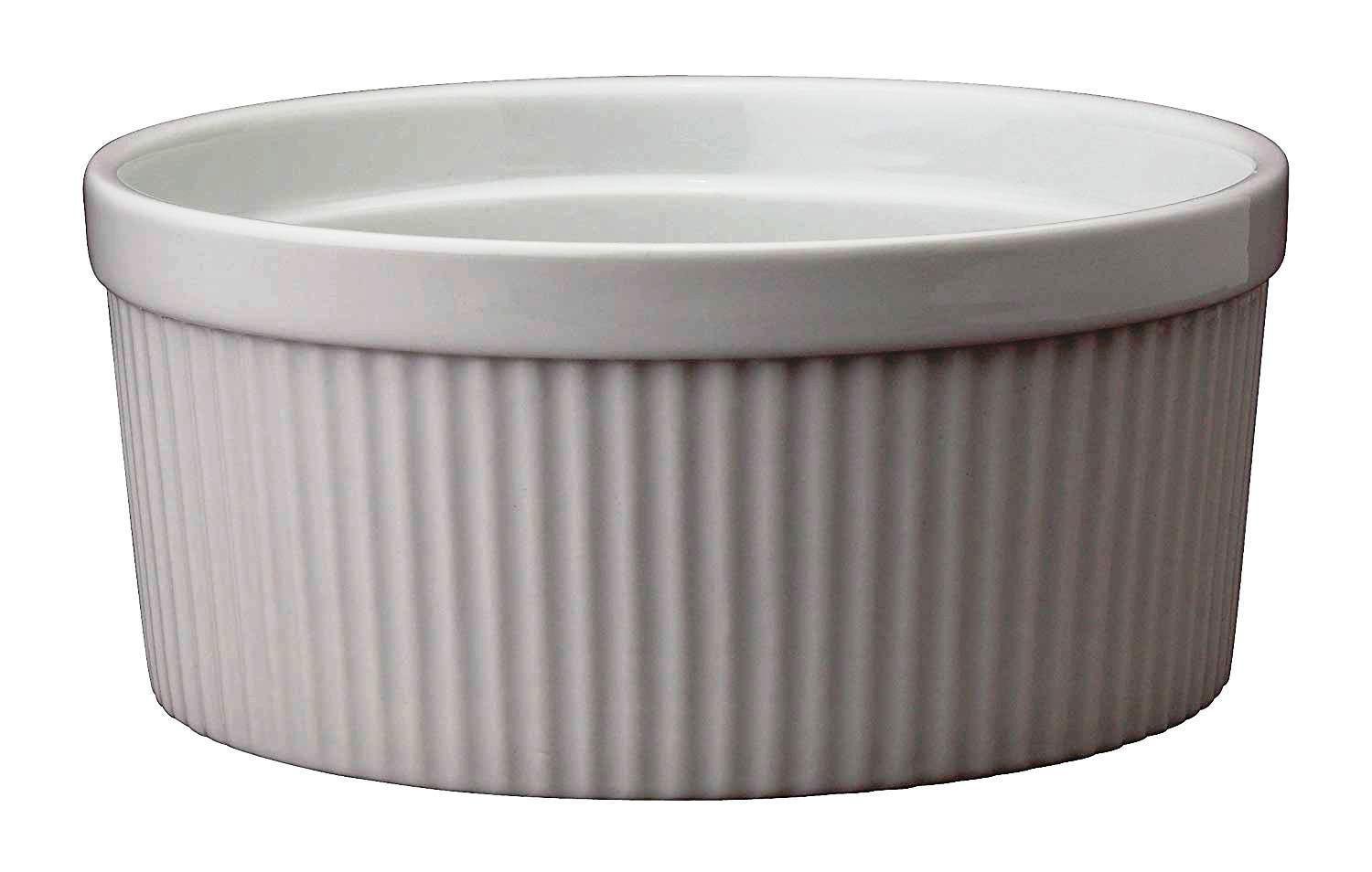 Expand your dinner and dessert repertoire with this 2 quart Souffle Dish. Impress your friends with delicate chocolate souffles, or delight your family with gourmet pasta dishes & casseroles. This versatile souffle baker is made from hardened white porcelain for a classic look that is safe for baking in the oven, warming in the microwave, and storing leftovers in the freezer. The 2-quart capacity (64 oz) is large enough to serve company. Measures 8" round. Dishwasher safe.