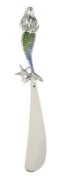 This elegant Mermaid butter knife or cheese spreader from Ganz has great detailing. It is embellished with green and blue colored enamel accents. It is made of sturdy zinc metal and measures approximately 6 1/8 inches.