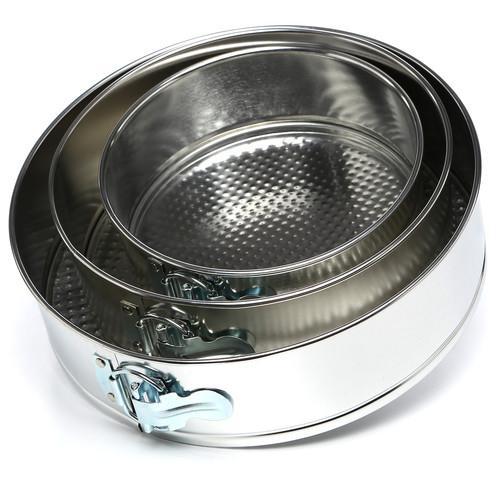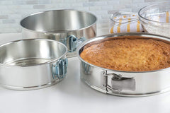 Love baking cakes, but hate trying to get a seamless removal from the pan? With this 3-Piece Springform Pan Set, the need to invert cakes for removal is no more! This set includes three springform pans ranging in size from 7-inch, 8.75-inch, and 10-inch, which are great for creating 3-tiered cakes. The pans' tight seal prevents leaks and their spring action makes for easy release and removal of baked goods. Because the cake remains on the pan's base after removing the outside band, these springform pans are perfect for delicate confections, flourless chocolate cakes, and creamy cheesecakes. The pans can also be used for making coffee cakes, ice cream cakes, 7-layer dip and more!