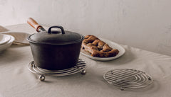 These trivets radiate style and function in the kitchen, from sun-up to sundown. Made of stainless steel and doubles as a mini cooling rack. Hand wash, wipe clean with a damp cloth.Measure 6" D x 0.5" H