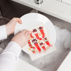 Hang in there during the busy Christmas season. Make quick work of dinner clean-up with a versatile Swedish sponge cloth for cleaning up all around the house. Made from cotton and plant-based cellulose fibers, these compostable cloths are an established must-have in Scandinavia. They offer a sustainable alternative to sponges, dishcloths and paper towels and become soft and pliable when wet for easy clean-up. Earth-friendly, reusable sponge cloth is a unique economical alternative to paper towels and sponges and is completely compostable – 8 x 6.5 inches. Crafted from a blend of 70% plant-based cellulose with 30% cotton and water-based inks, this cloth is a sustainable choice that's gentle on the environment.