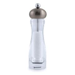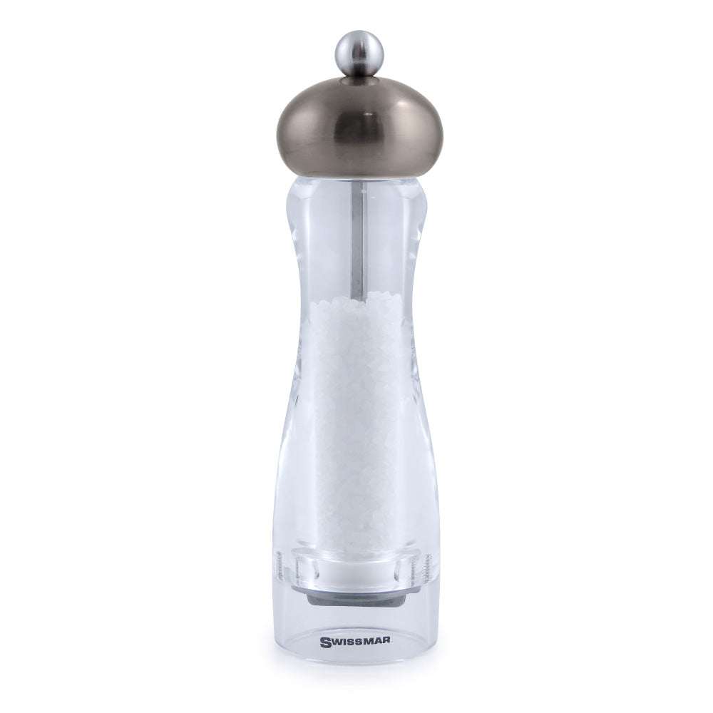 Beautifully-designed gun metal and acrylic mills add elegance and style to any table top. Ceramic mechanism is harder than steel, odorless, rust and corrosion-proof with a lifetime warranty. High grade stainless steel shaft for superior performance. Multi-purpose mill grinds pepper, salt, dry herbs and dry spices. Grind is adjusted by turning the top nut: turn it clockwise (tighten) for a finer grind; counter-clockwise (loosen) for a coarser grind.