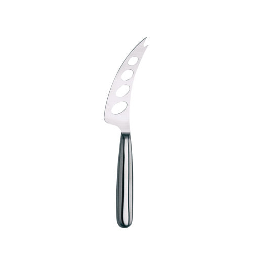 Brushed stainless steel, 9.25 inch cheese knife. Perfect for moist cheeses such as feta and blue cheese. Features a forked tip and holes in the blade to prevent cheese from sticking. Hollow handle. Measures 9.25 inches.