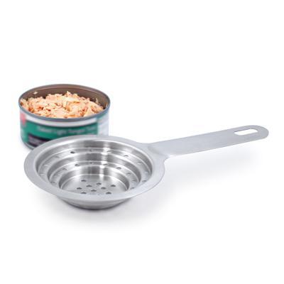 Strain and drain with NO mess. Made of high quality 18/8 stainless steel. Fits most size can openings. Ideal for straining tuna, corn, pineapple chunks, peas, and many more. This versatile strainer is a must have for every busy kitchen. Dishwasher safe.