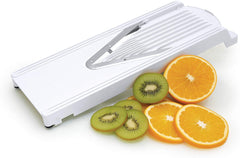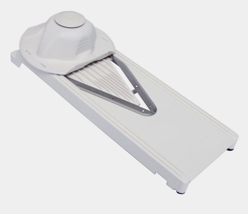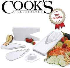 An inexpensive alternative to a professional stainless-steel mandoline, this device makes it possible to quickly, uniformly, and safely slice and julienne vegetables and fruits. It also shreds cabbage and neatly dices potatoes, tomatoes, and onions. For safety, a holder firmly grips food with stainless-steel prongs so fingers are protected from the German surgical-steel blades, and the three inserts accompanying the device lock in position. The inserts act as a guide for slicing against the V-frame's knife that reverses to create slices either 1/4-inch or 1/16-inch thick and two julienne inserts for creating 1/8-inch or 3/8-inch strips. For storage, the V-frame, all three inserts, and the safety holder fit into a caddy that can stand upright on the counter, lie flat in a drawer, or hang on the wall. Made of rugged plastic, the device measures 15 inches long and 6 inches wide when assembled for storage.