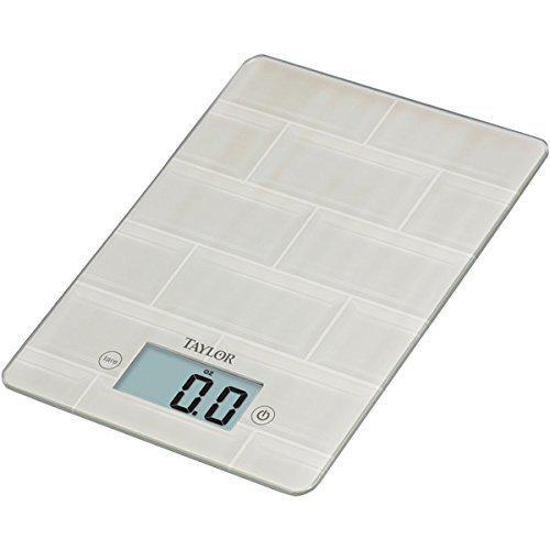 This Taylor glass top kitchen scale has an 11 lb/5kg capacity weighing in 0.1 oz or 1 gram increments. The subway tile look glass top resists stains and flavor carryover. Includes tare weight and auto/manual shutoff features. Battery included.3812TL