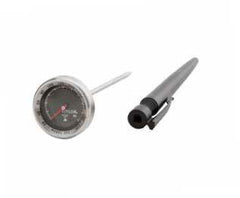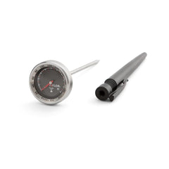 Professional grade, instant read thermometer with a textured finish pocket sleeve. Printed temperature scale on the top of the bezel. Dark, high contrast dial.