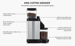 The Moccamaster KM5 Burr Grinder contains a powerful, direct-drive motor that grinds coffee quickly and efficiently, and its static-reducing dispensing spout creates a mess-free grinding experience. The stepless knob allows for the finest adjustment of the 50 mm flat steel burrs, providing a precise, uniform grind at the exact size...
