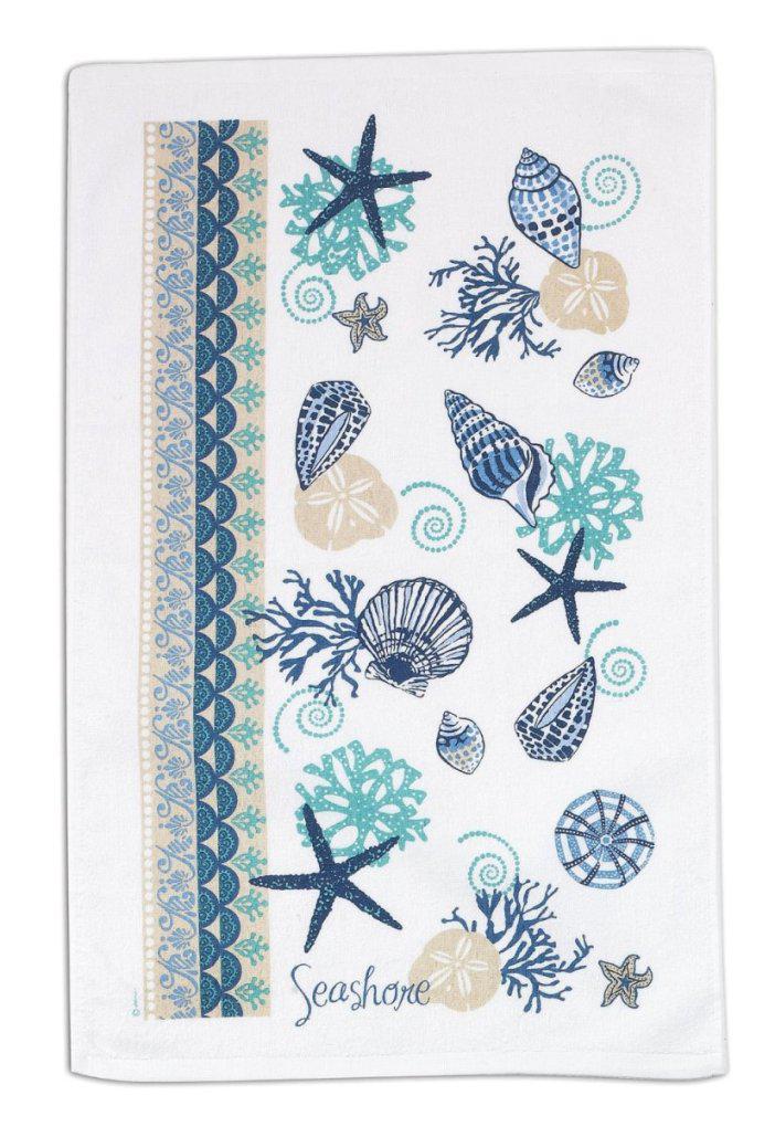 Coastal Blue Starfish Coral Shells Kitchen Print Terry Dish Towel, 100% cotton, measures 26 inches by 16 inches.