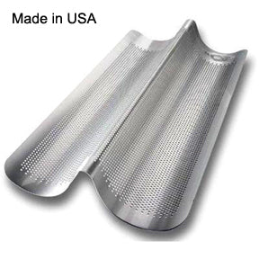 Italian Loaf Pan constructed of nonstick aluminized steel. The heavy gauge aluminized steel with perforated surface createsa crisp golden crust. The unique textured surface adds strength and facilitates air circulation. Oven safe up to 450 degree F. Makes two loaves at once. Measures 3.5 inches by 16 inches. The clear nonstick silicone coating is PTFE and PFOA free. USA Pan is the largest manufacturer of commercial bakeware in the world and has been producing professional grade pans for over 50 years. The exclusive ridged surface circulates air all around the food providing a continuously even baking temperature for uniform results.