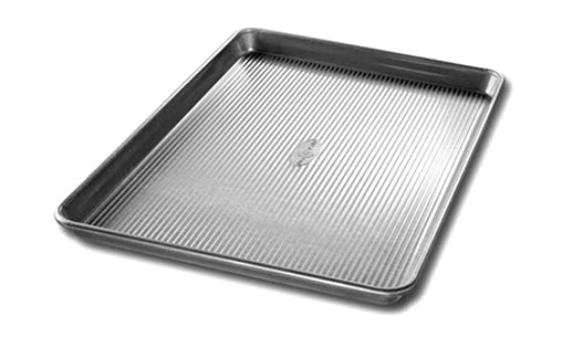 10 x 15 inch jelly roll pan constructed of nonstick aluminized steel. Bake cookies, pastries, biscuits, rolls, pizza, fries, sandwiches, jelly rolls, fudge, or candy. The thickness of the metal allows for even heat distribution up to 400 degrees F. Steel wires built into the pans provide additional strength and prevents warping. The clear nonstick silicone coating is PTFE and PFOA free. MADE IN USA with a lifetime manufacturer’s warranty. USA Pan is the largest manufacturer of commercial bakeware in the world and has been producing professional grade pans for over 50 years. The exclusive ridged surface circulates air all around the food providing a continuously even baking temperature for uniform results.
