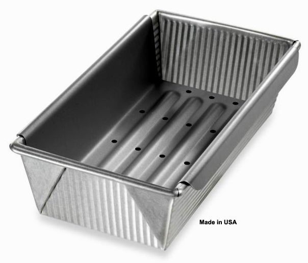 10 by 5 inch meat loaf pan with insert constructed of nonstick aluminized steel. The thickness of the metal allows for even heat distribution up to 400 degrees F. Steel wires built into the pans provide additional strength and prevents warping. The clear nonstick silicone coating is PTFE and PFOA free. MADE IN USA with a lifetime manufacturer’s warranty. USA Pan is the largest manufacturer of commercial bakeware in the world and has been producing professional grade pans for over 50 years. The exclusive ridged surface circulates air all around the food providing a continuously even baking temperature for uniform results.