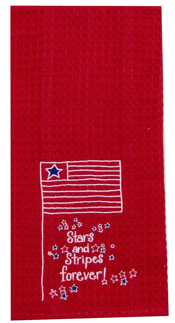 Perfect for Independence Day, Memorial Day, or show your patriotism every day! loads of fun patriotic embroidery by artist Dan Dipaolo is the star of this waffle towel, which has a convenient loop for hanging, and a thick waffle weave. The waffle weave makes this towel absorbent, and the embroidery makes it a personal statement for your kitchen, or a meaningful gift! Measures 28 inches by 18 inches.