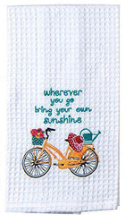 Fun embroidered design features a bicycle and an uplifting message by artist Suzanne Nicoll, with meticulous embroidery, thick waffle weave, and a loop for hanging. The waffle weave makes this towel absorbent, and the embroidery makes it a personal statement for your kitchen, or a meaningful gift! Measures 28 inches by 18 inches.