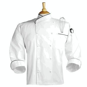 Soft cotton, a crossover collar, ten white, hand-rolled buttons, two-piece executive back, and black piping around the neck, cuffs and pocket make this chef coat a sharp looking addition to any chef’s wardrobe.