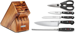 WÜSTHOF'S best-selling collection for generations, CLASSIC full-tang knives are precision-forged from a single piece of an exclusive high-carbon stainless steel. This simple set includes every piece you need to tackle any recipe from the versatile cook's knife to kitchen shears. Designed with a sleek, full tang handle, each piece of this knife block set is both easy on the eyes and the cutting board. Forged from high-carbon stainless steel and finished with Precision Edge Technology, these blades retain their edge for twice as long as average cutlery. To help you maintain your Wusthof cutlery, this set includes a honing steel.