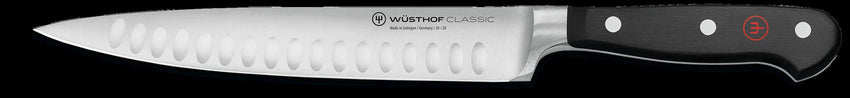 The Wusthof® CLASSIC 8" Hollow Edge Slicing/Carving Knife brings precision slicing to the carving board. The oval grooves ground along the edge reduce friction for easier slicing. This knife is forged from one piece of specially tempered high carbon stainless steel for exceptional strength. The special steel alloy that comprises the blade assures that it is exceptionally sharp and has a long-lasting, easily restorable edge. The bolster provides heft and balance as well as a finger guard for safety and comfort. Full tang construction from the bolster through the back of the handle for a solid feel and confident control. The riveted synthetic handle is smooth and seamless for a comfortable grip.